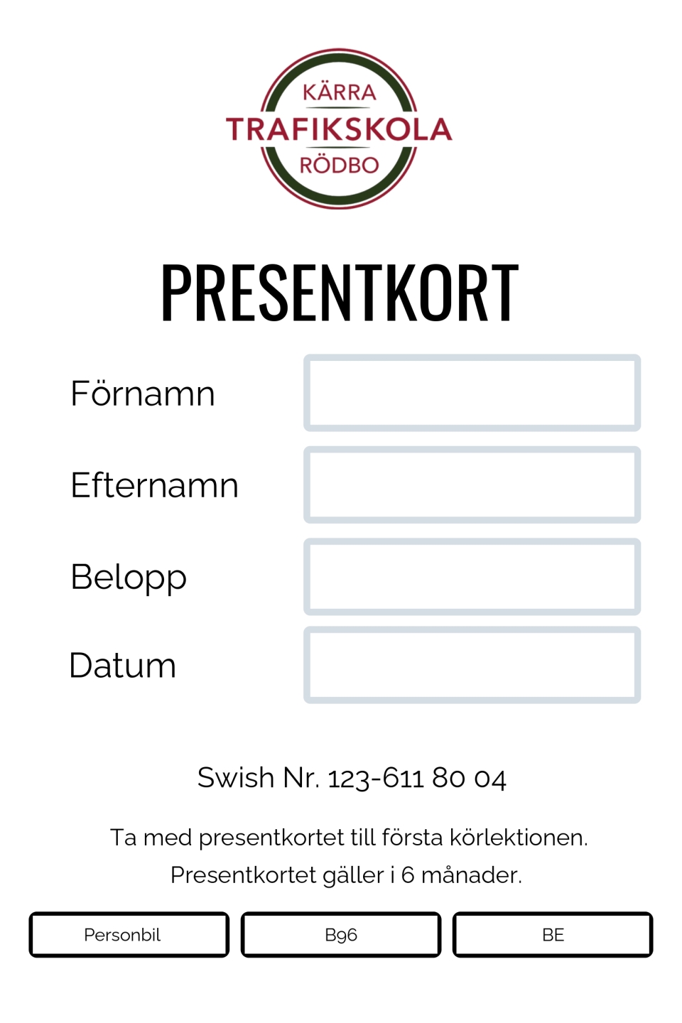 Swisha valfritt belopp till trafikskolan och märk med "presentkort/ elevens namn".